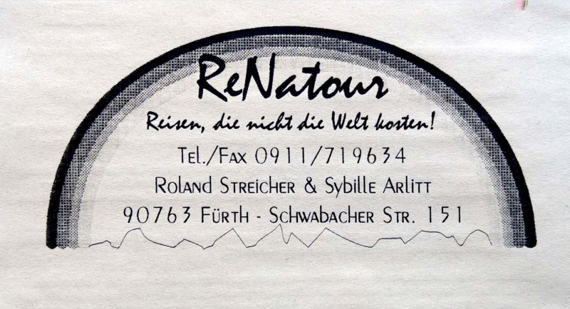Am 02.05.1994 wird ReNatour als Einzelunternehmen gegründet. Tätigkeit laut Gewerbe-Anmeldung beim Amtsgericht Nürnberg: Reisevermittlung und -veranstaltung, Sportgeräteverleih. Die Idee: "Sanfte" Reisen bekannter machen.