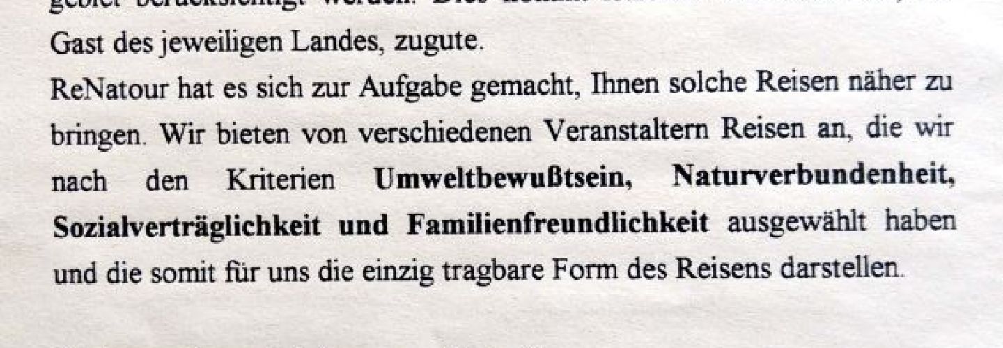 Doch wie kam es zum Namen ReNatour? Gesucht war eine Bezeichung, die für die Philosophie des Unternehmens steht. Notiert wurde alles, was zum Thema passte und in einen Topf geworfen: Reisen, Umwelt, Spaß, sanft, bio, Tourismus, Erholung, Natur, öko, Urlaub usw. Am Ende hatte Sybille die Idee:
