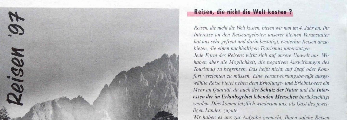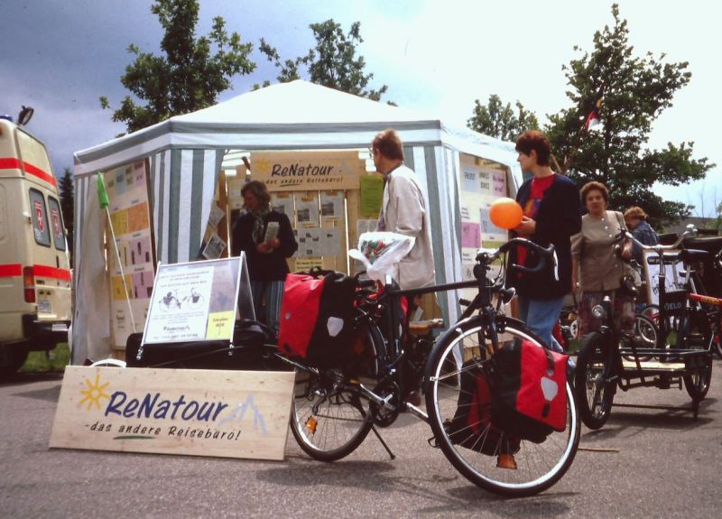 Um ReNatour bekannt zu machen, gingen wir auf viele Messen. Regionale Messen wie die LEBEN2000 in Schwabach oder Roth und auf die neu geschaffene "ÖkoWelt" in Nürnberg und München. Kaum zu glauben, dass daraus die heutige Welt-Leitmesse der Naturkostbranche "BioFach" entstand. Der jährliche Treff für alle alternativen Reiseveranstalter war der Reisepavillon in Hannover.