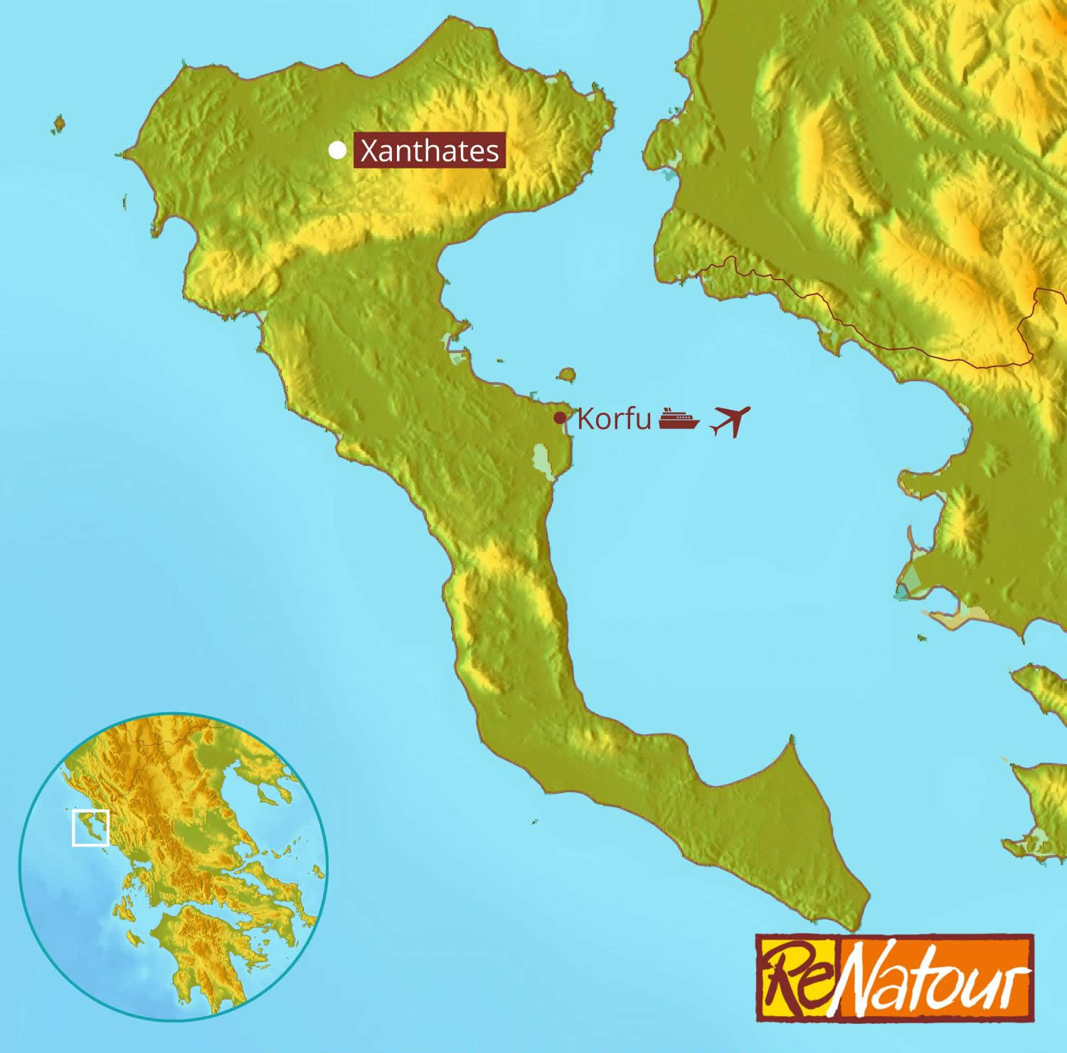 Anreise- Mit Bahn/Auto und Fähre: Bahnfahrt nach Ancona (Fahrzeit z.B. von München ca. 11 Std.). Alternativ Autofahrt nach Ancona (Entfernung von München ca. 800 km, Fahrzeit ca. 8 Std.). Fährfahrt ab Ancona via Igoumenitsa nach Korfu. Von Juli-September zusätzlich eine Direktverbindung ab/bis Bari nach Korfu.