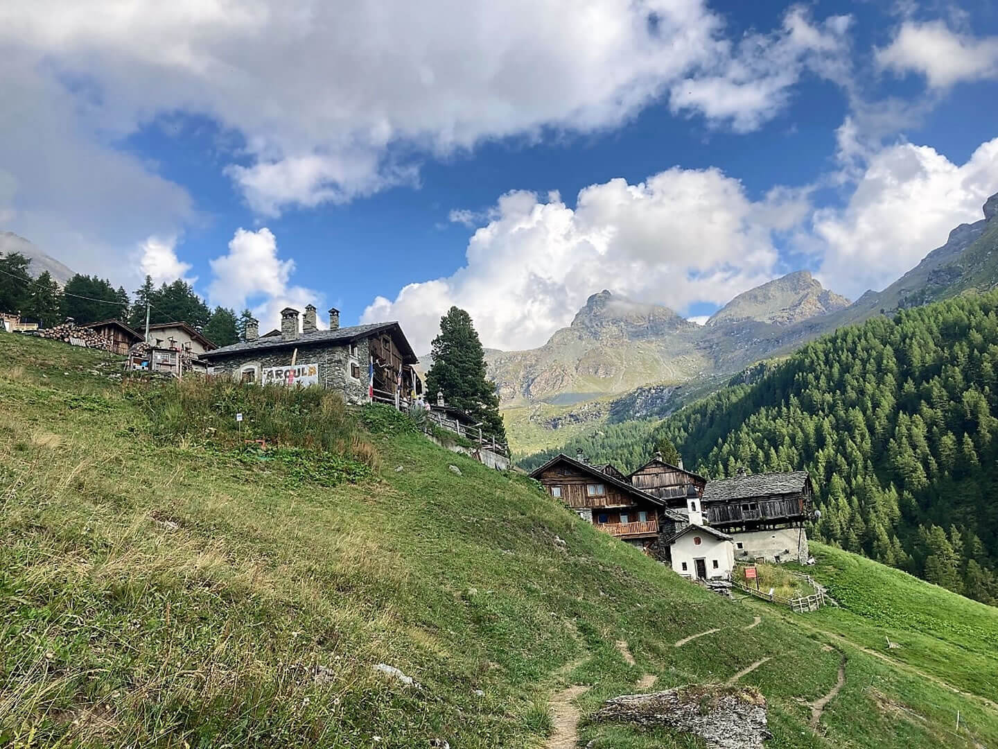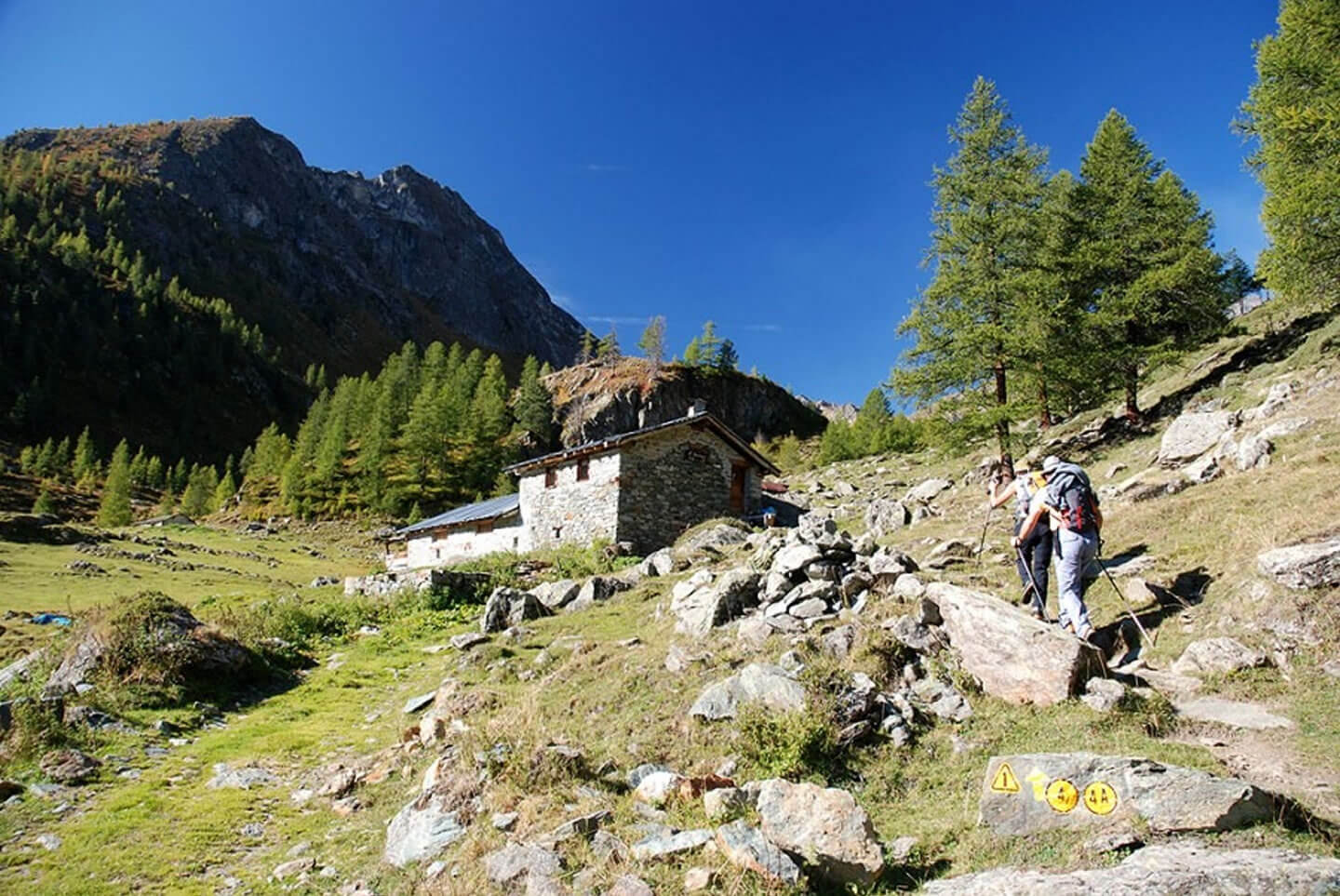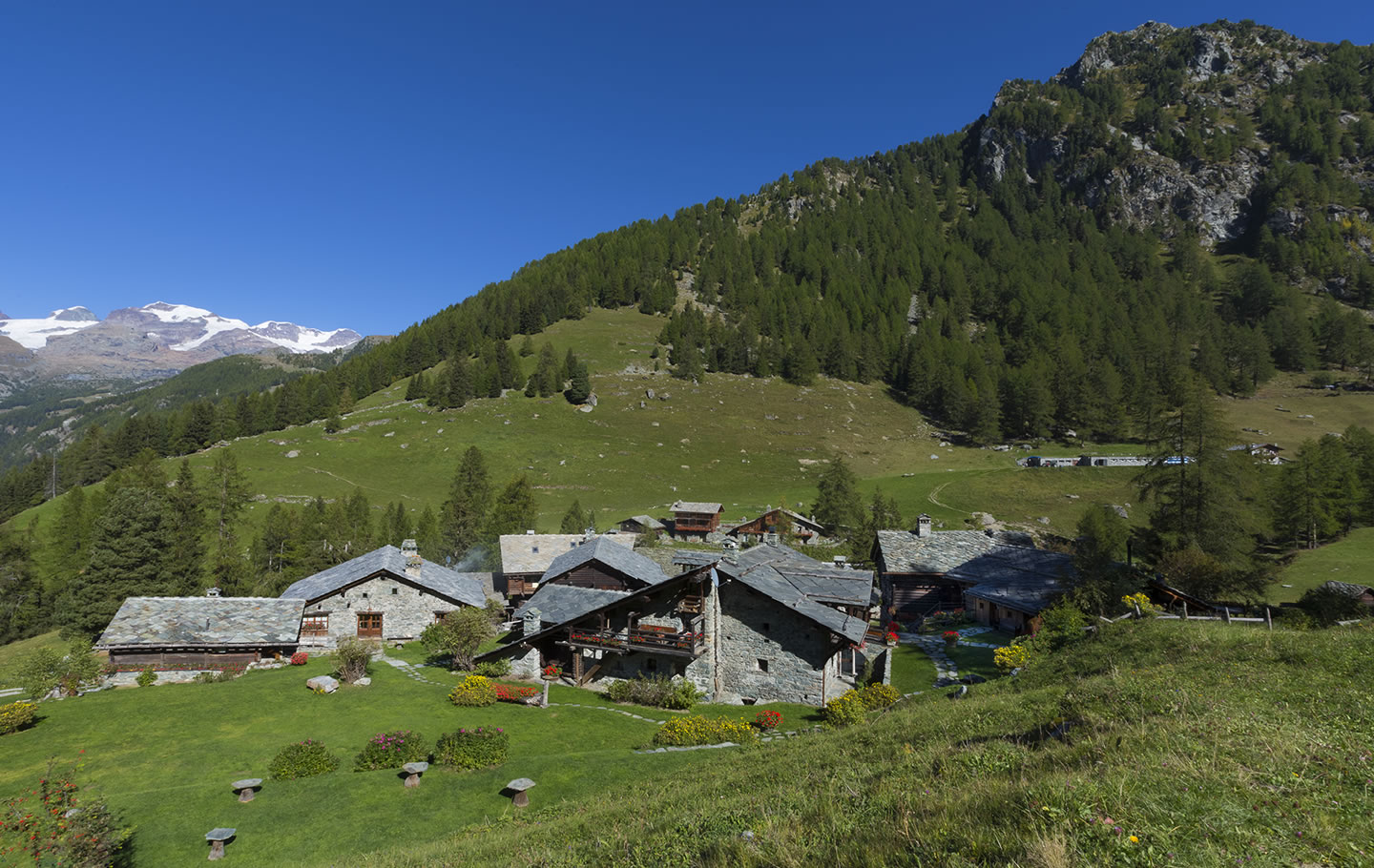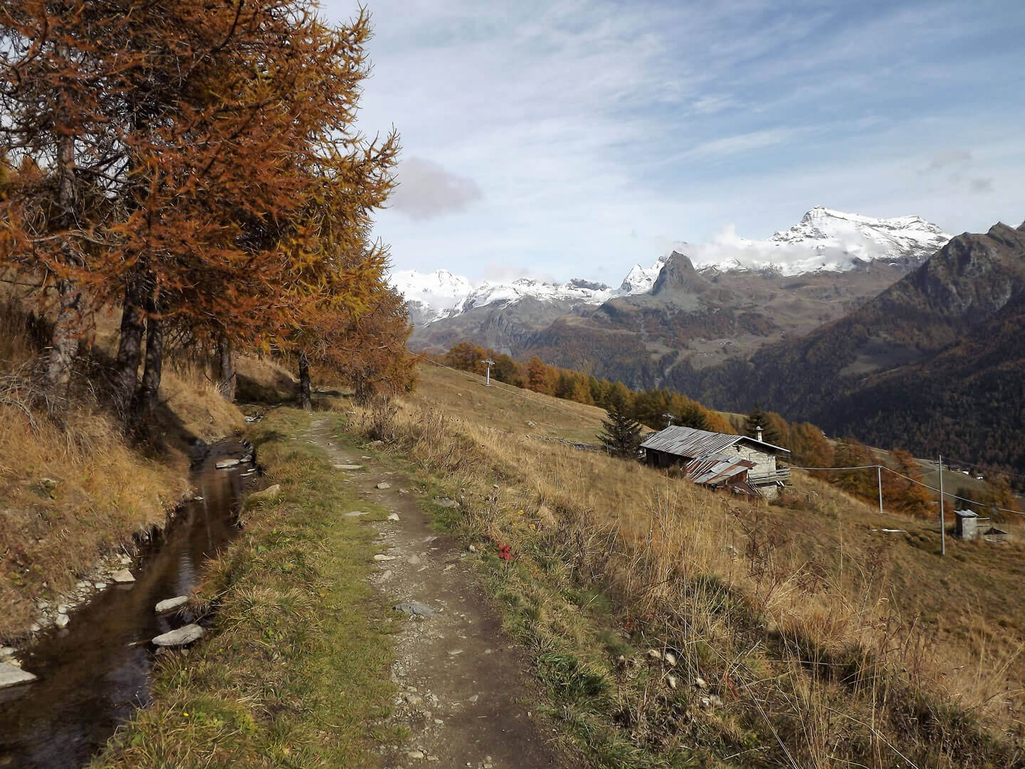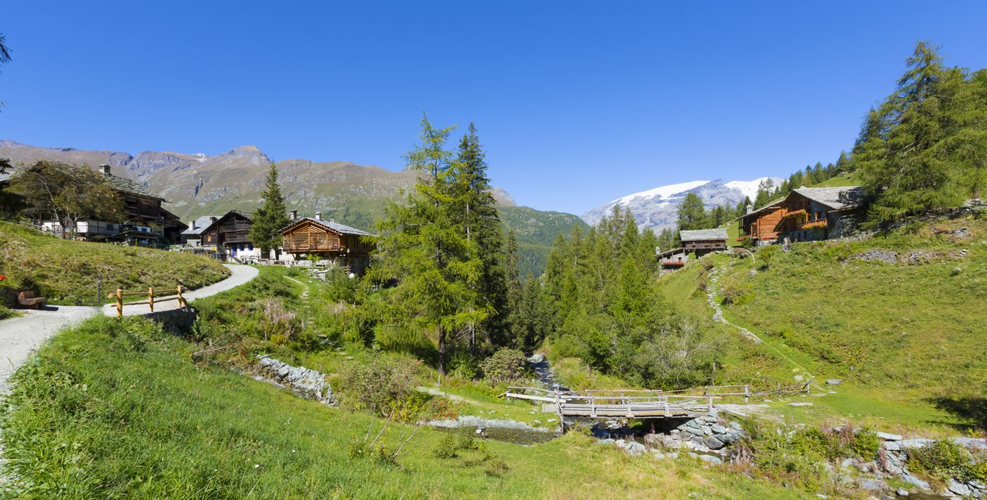 Die erste Etappe beginnt mit einem Aufstieg durch den Bergwald oberhalb von Brusson. Aus dem Holz der Bäume werden noch heute die einstmals für die Region typischen Holzschuhe in Handarbeit hergestellt. Am Col de Joux (1.693 m) bietet sich bei klarem Wetter einen herrlichen Blick auf die Berggipfel bis zum Mont Blanc. Der Weg verläuft weiter entlang eines Bewässerungskanals und durch 14 in den Fels geschlagene Tunnel, die bereits im Mittelalter angelegt wurden. Wenn Sie die Hochebene von Barmasc (1.900 m) erreichen, auf dem früher die Hirten im Sommer lebten, haben Sie Ihr erstes Etappenziel erreicht. Sie übernachten in einer komfortablen Pension mit kleinem Wellnessbereich. Das schmackhafte Abendessen wird im Restaurant nebenan serviert.