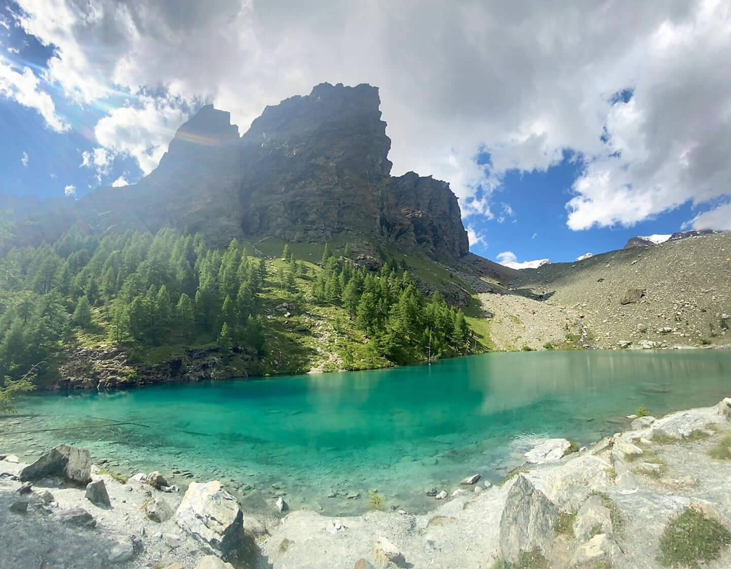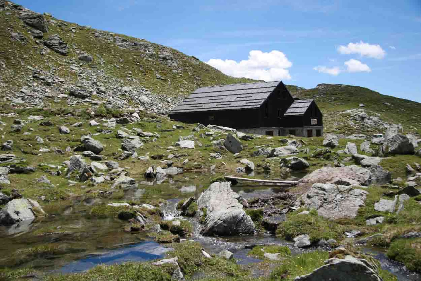 Von Barmasc folgen Sie wieder dem Weg entlang des Bewässerungskanals bis Sie die Alm von Metsan erreichen. Hier beginnt der Bergpfad 3F, der zum Nana-Pass führt. Nun geht es hinauf durch typisch alpines Gelände bis zum kleinen Gletschersee Lechien (2.276 m), von dem man bei klarem Wetter einen großartigen Blick auf die Bergmassive Monte Rosa und Matterhorn genießen hat. Dann beginnt auf einem zick-zack-Pfad der Abstieg zum weiten Nana-Tal und zur Ortschaft Saint Jacques (1.689 m), die früher Kreuzung und Übernachtungsstation auf der alten Handelsroute vom Ayas Tal nach Zermatt war. Von Saint Jacques geht es weiter hinauf zur Hochebene "Piani di Verra". Von der "Piani di Verra" ist optional einen Aufstieg zum Gletschersee "Lago Blu" möglich. Der Gletschersee hat sich in der Moränenlandschaft gebildet und befindet sich unterhalb des Verra-Gletschers. Wer nicht zum "Lago Blu" laufen möchte, geht auf der anderen Seite der Hochebene weiter bis zum Rifugio Ferraro, dem heutigen Etappenziel. Das Abendessen wird direkt in der Hütte serviert.