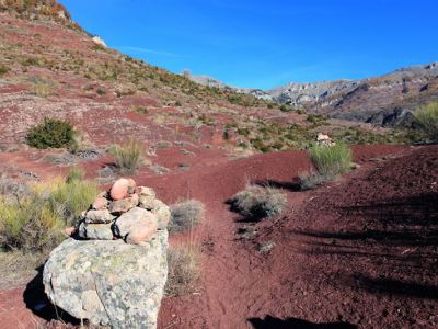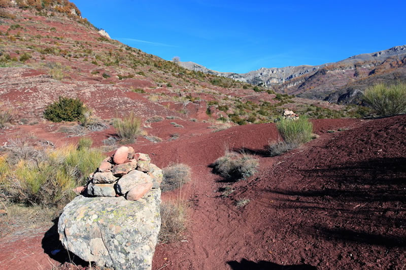 Sie wandern auf dunkelroter Erde und einem alten Römerweg zu den Schluchten von Daluis bis zum Aussichtspunkt "Belvedère".