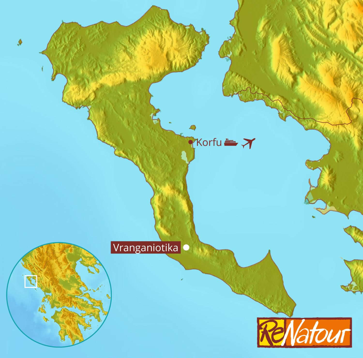 Anreise- Mit Bahn/Auto und Fähre: Bahnfahrt nach Ancona (Fahrzeit z.B. von München ca. 11 Std.). Alternativ Autofahrt nach Ancona (Entfernung von München ca. 800 km, Fahrzeit ca. 8 Std.). Fährfahrt ab Ancona via Igoumenitsa nach Korfu. Von Juli-September zusätzlich eine Direktverbindung ab/bis Bari nach Korfu.