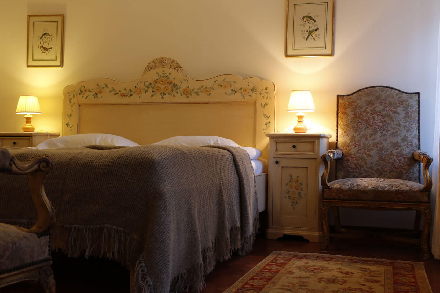 Die Gästezimmer sind unter Berücksichtigung der ursprünglichen Architektur nachhaltig und authentisch restauriert. Verwendet wurden viele Naturmaterialien wie z.B. heimisches Lärchenholz für die Wände und Pfeiler und Schafwolle für die Isolierung. Ausgestattet sind die Zimmer u.a. mit hochwertigen Vollholzmöbeln, Wollteppichen und traditionellen Parkettböden. Jedes Doppel- bzw. Familienzimmer verfügt über ein Badezimmer mit Dusche/WC, Minibar und WLAN-Empfang bzw. ADSL-Internetanschluss. Einige Zimmer besitzen zusätzlich einen Schreibtisch und einen Safe.