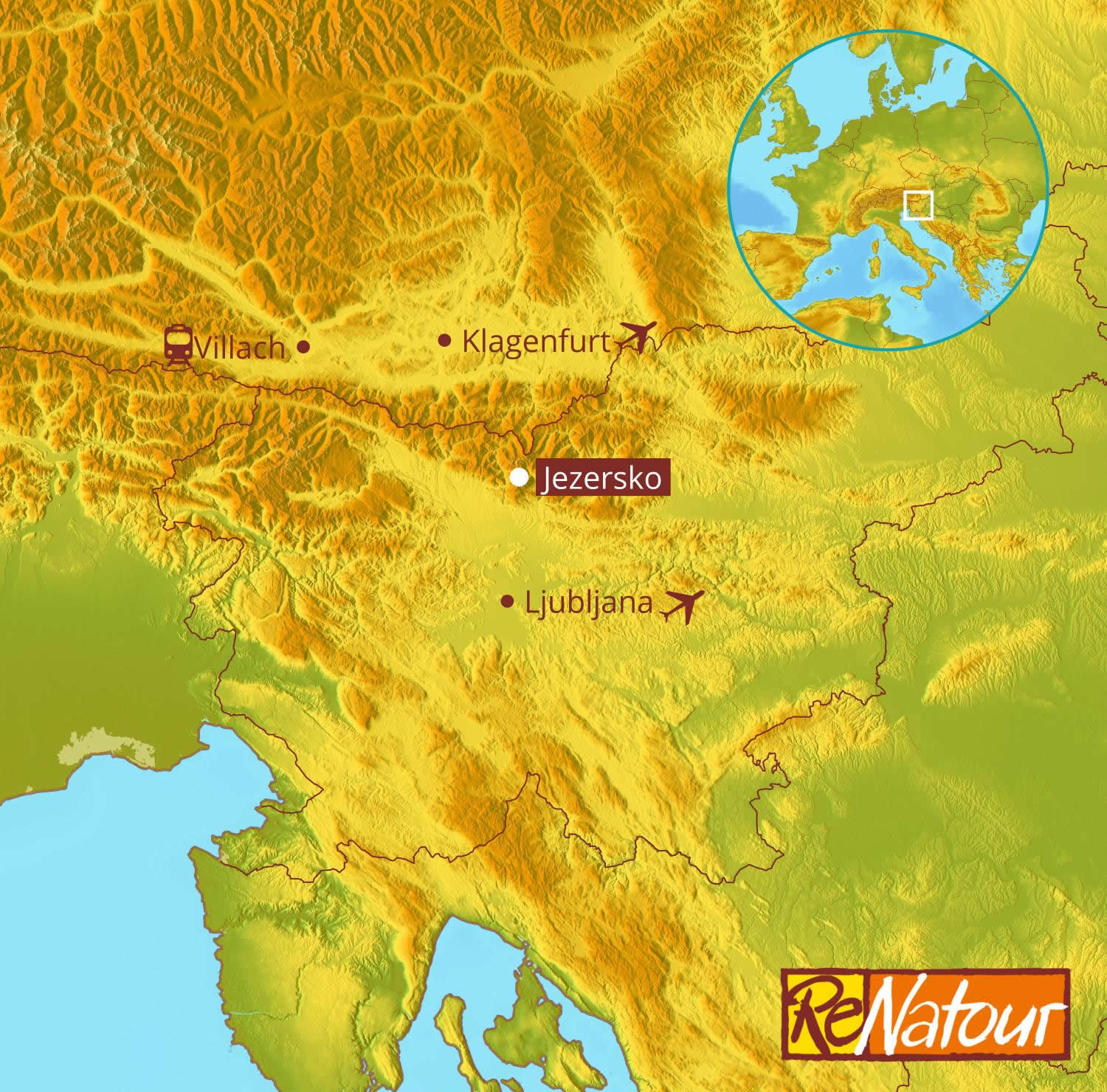 Anreise- Mit dem Auto: Individuelle Anreise nach Jezersko (ca. 400 km von München, ca. 800 km von Frankfurt, ca. 1.000 km von Berlin, ca. 1.200 km von Hamburg)