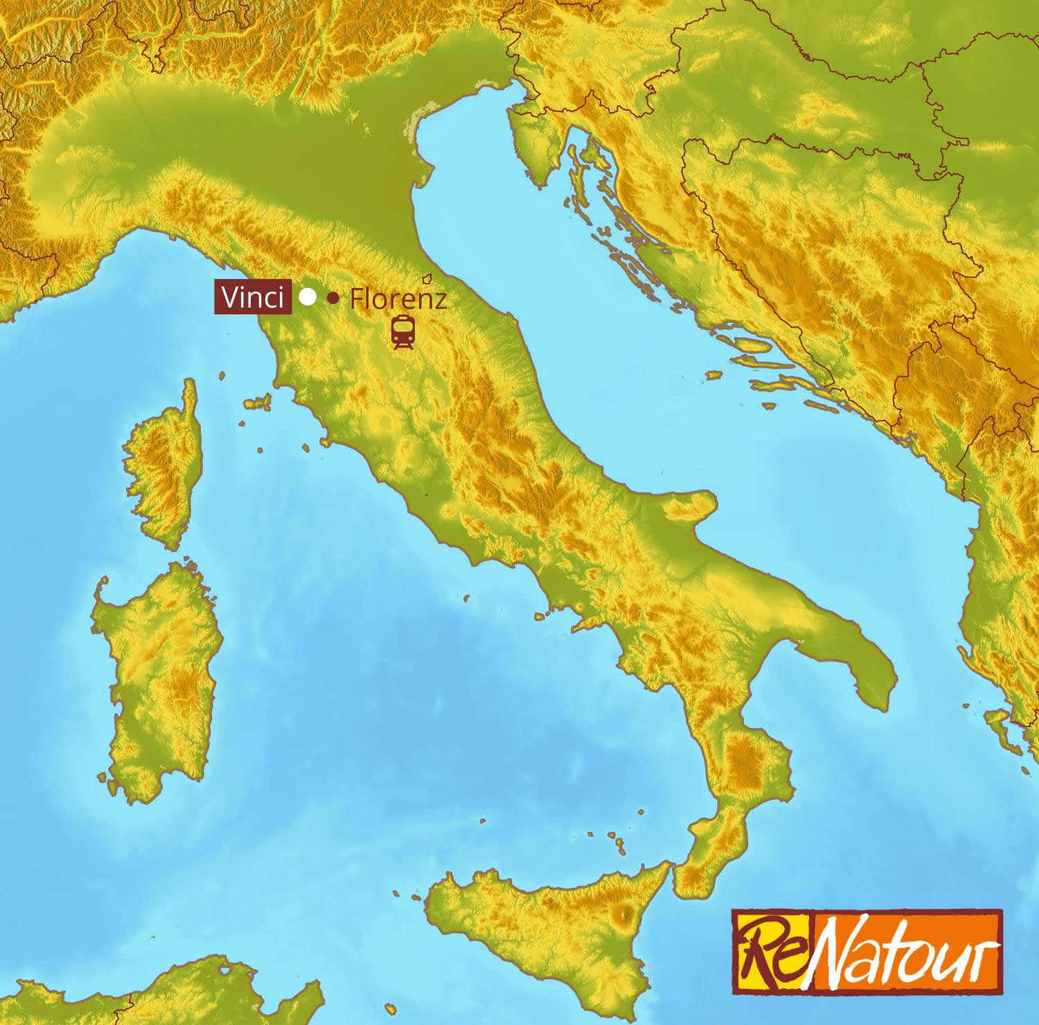 Anreise- Mit der Bahn: Anreise bis Florenz, Fahrzeit z.B. ab München ca. 8 Std., ab Frankfurt ca. 10 Std. Weiter mit dem Mietwagen nach Vinci (ca. 1 Std./60 km).