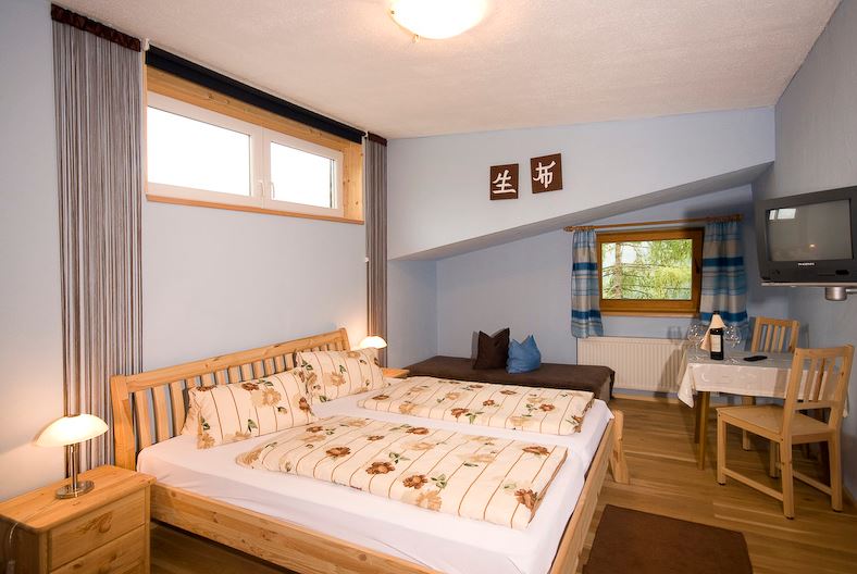 - Bio-Nester (ca. 25 qm) und Panoramablick-Zimmer (ca. 18 qm): mit Holzboden und Balkon, zur Süd- oder Westseite und mit Panoramablick auf den Thiersee. Bio-Nester zusätzlich mit Sitzecke und Vollholzmöbeln