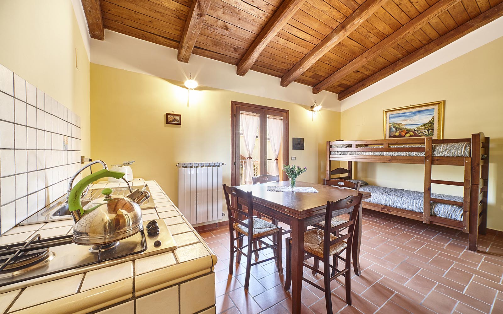 - Il Corbezzolo (45qm, 2-4 Pers.): 1 großes Schlafzimmer, Wohnraum mit Kochnische und Stockbett, Bad, Terrasse mit Ausblick.