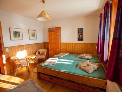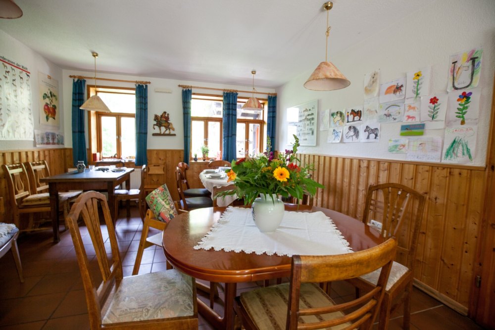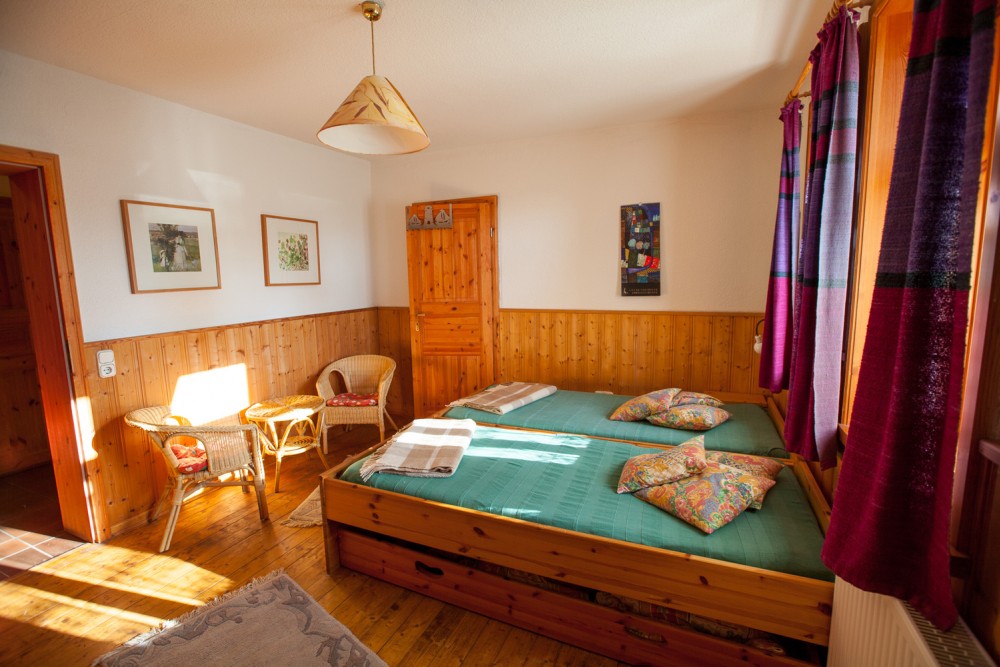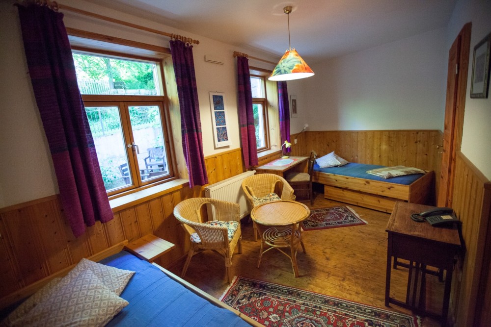 Wohnen in der PensionDie Pension bietet sechs gemütlich und wohnlich eingerichtete Doppelzimmer und vier Familienzimmer (zwei separaten Zimmer mit gemeinsamem Badezimmer). Alle Zimmer sind mit massiven Kiefernholzmöbeln und schönen alten Schränken sowie Dusche/WC und Durchwahltelefon ausgestattet. Ein Pollenfilter macht die Zimmer auch für Menschen mit Pollenallergien angenehm. Der Speiseraum der Pension mit seiner Wohnzimmeratmosphäre eignet sich gut für gemeinsame Aktivitäten. Ein zusätzlicher großer Saal kann für Familienfeiern, Seminargruppen und kreative Tage genutzt werden.