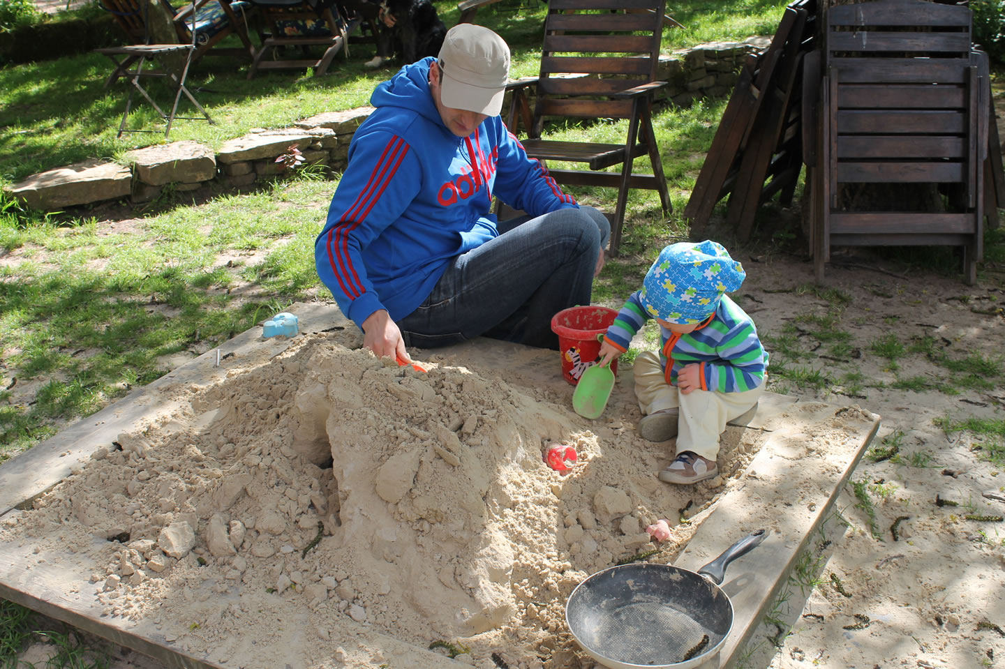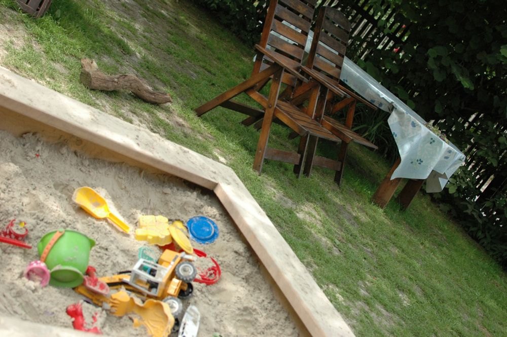Für Kinder- Sandkasten, Ballspielmöglichkeiten und Tischtennis auf dem Hof, einen Spielplatz gibt es im Dorf.