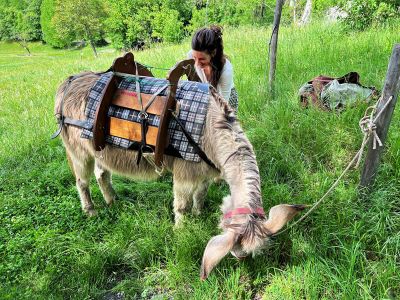 Unterwegs mit Esel- Pro Familie/Kleingruppe ist 1 großer Esel für den Gepäcktransport vorgesehen. Der Esel kann maximal 40 kg Gepäck tragen, das auf 2 Packtaschen (ähnlich Seesäcken) verteilt wird. Die Packtaschen werden vor Ort gratis verliehen.