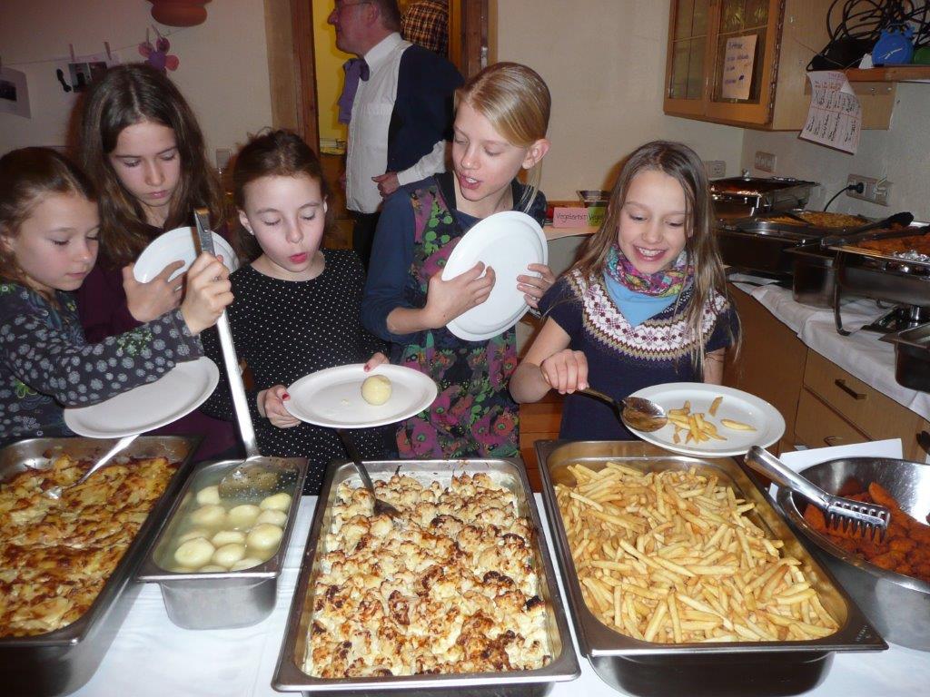 Die Vollpension in diesem Familien-Skiurlaub besteht aus Frühstück, Lunch- Paket und Abendessen, auf Wunsch auch vegetarisch. Wie in Jugendhäusern üblich, helfen alle mit beim Tischdecken und Abräumen.