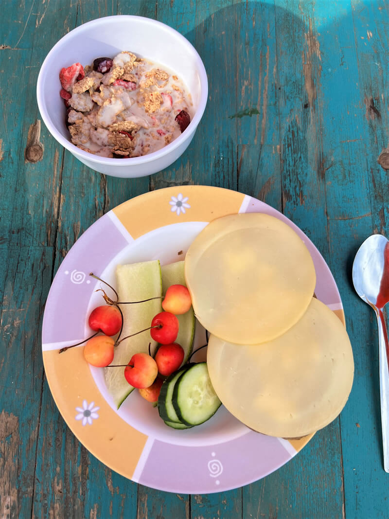 Für Ihr leibliches Wohl ist bestens gesorgt. Im Preis enthalten ist jeden Morgen ein reichhaltiges Frühstück mit Brot, verschiedenen Sorten von Konfitüre, Aufschnitt, Käse sowie Müsli oder Frischkornbrei, Kaffee, Tee, Milch, Wasser und frischem Obst. Für die Verpflegung tagsüber kann sich jeder Gast dort bedienen und sich sein Lunchpaket selbst zusammen stellen. Ein selbst eingekauftes Mittagessen kann gerne in den Camp-Kühlschränken gelagert werden.