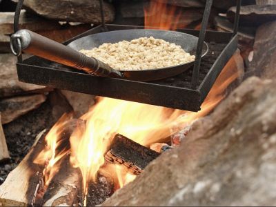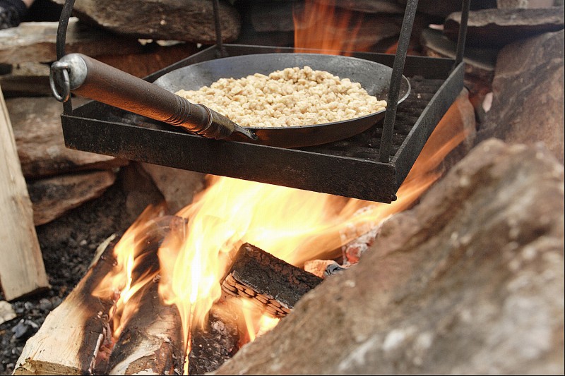 Auf der Kanutour, wenn wir draußen unterwegs sind, kochen alle gemeinsam. Die Verpflegungstonnen sind üppig mit haltbaren Lebensmitteln bestückt. Frisch gepflückte Blaubeeren ergänzen den Speiseplan. Das Wasser schöpfen wir aus den reinen und klaren Seen. In Gammelbyn ist der Koch für die Zubereitung der Mahlzeiten zuständig, so dass Sie sich etwas zurücklehnen können. Das Frühstücksbuffet und das Abendessen, mit Vor- und Nachspeise, Hauptgericht und Salat, werden im Speiseraum des Rezeptionsgebäudes aufgetischt.