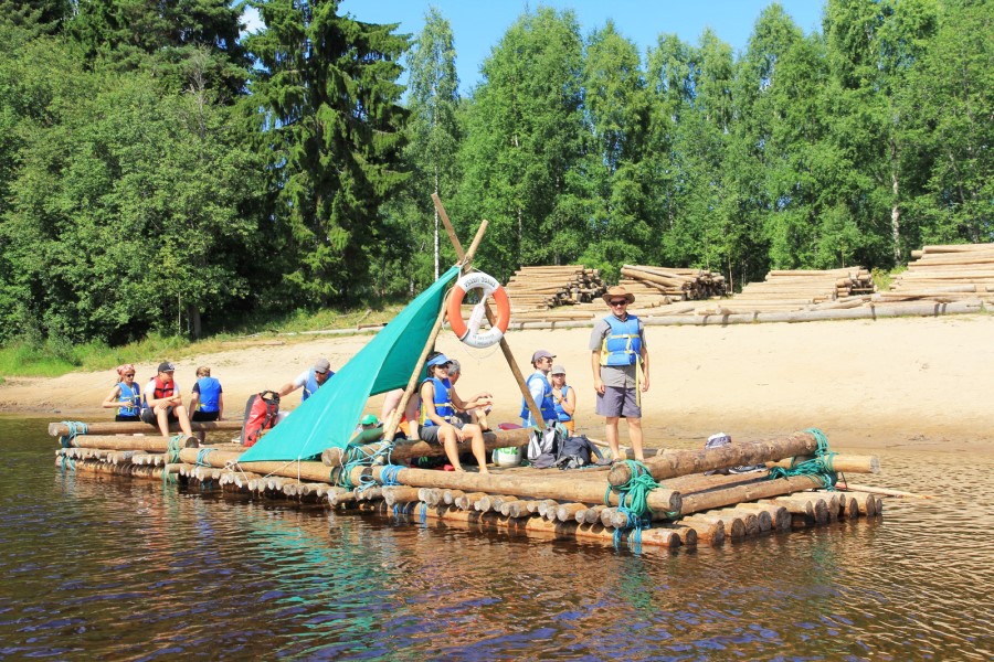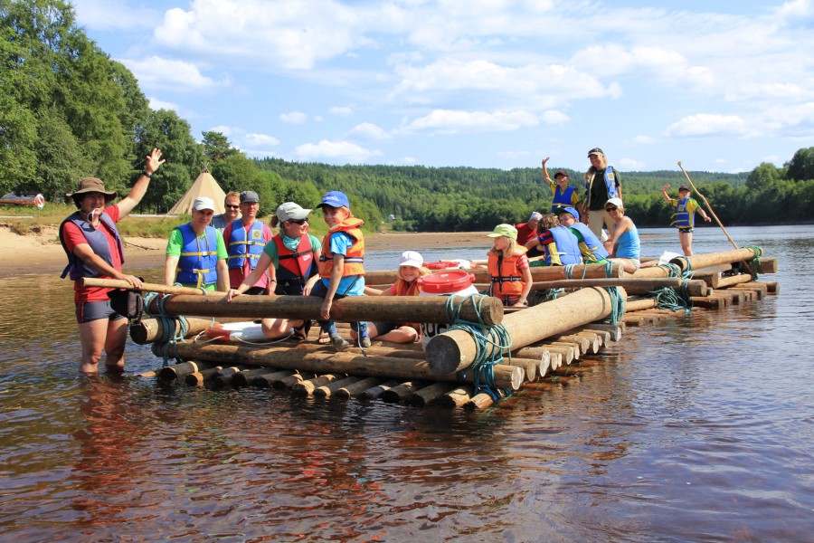 Eine Tagestour führt zum Klarälven, ca. 50 km entfernt. Hier wartet ein besonderes Abenteuer. Zwischen 1830 und 1991 wurde auf dem Fluss betriebsmäßig Holz geflößt. Wir tun es den Flößern nach und bauen stabile Gefährte aus 3 m langen Rundhölzern. Alle packen mit an. Wir rollen und tragen die Stämme ins Wasser, wo sie unter fachkundiger Anleitung mit Seilen zusammen gebunden werden. Nach getaner Arbeit lassen wir uns dann treiben. Mit mäßiger Geschwindigkeit folgen die Flöße den Windungen des Flusses. Sandbänke und Strömungen sorgen für Spannung und Vergnügen.