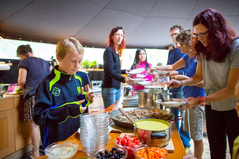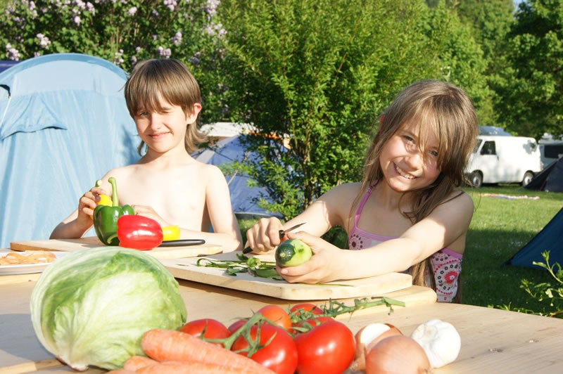 - Die Mahlzeiten werden nach einem fest stehenden Wochenplan gemeinsam in der Campküche zubereitet. Vorbereiten, Kochen, Aufräumen, Spülen sind Aufgaben der ganzen Gruppe (Einteilung in einem "Küchenplan"). Fleisch wird meist bei regionalen Metzgern eingekauft. Bei Eiern, Wurst, Käse und Milch werden regionale oder "Bio"-Produkte bevorzugt. Die Gerichte können bei Bedarf entsprechend der zur Verfügung stehenden Lebensmittel vegan oder laktosefrei angepasst werden.