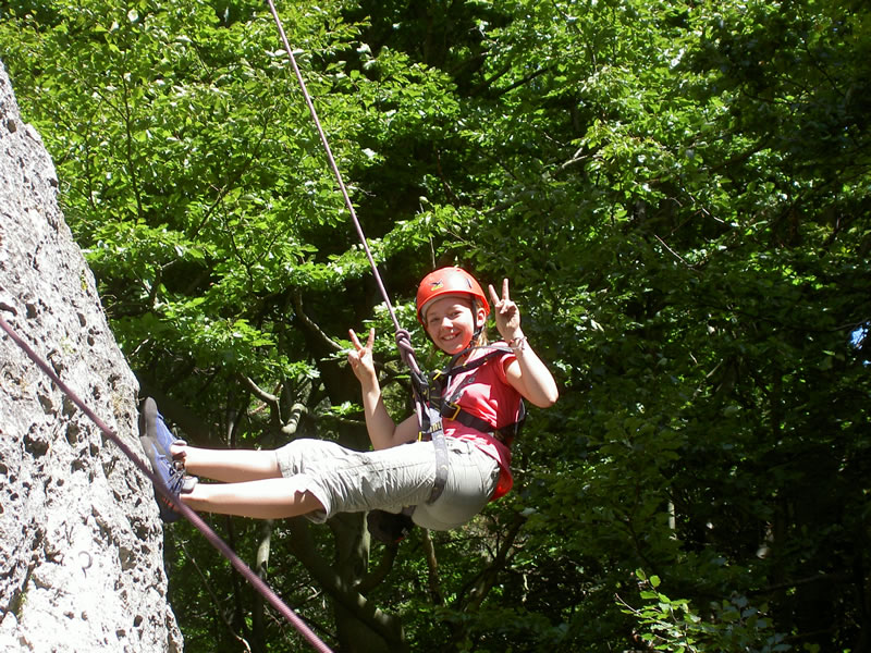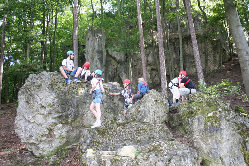 Sammelt erste Erfahrungen im Felsklettern! Nach einer ausführlichen Einweisung könnt ihr die Felsen immer gut gesichert auf unterschiedlich schwierigen Routen erklimmen. Egal ob ihr Anfänger seid, oder schon Erfahrung habt, die Kalkfelsen im Nürnberger Land werden jedem Spaß machen, denn nicht umsonst ist diese Region ein ausgesprochenes Paradies für Kletterer. Neben dem Felsen gibt es noch verschiedene Klettersteige zum selbständigen Erkunden: ein einzigartiger Kinder-Klettersteig und der sportliche Höhenglücksteig für alle älteren Kinder (ab 12 Jahren) und natürlich für die Eltern! Der Kletterfelsen ist zu Fuß vom Zeltplatz aus in ca. 30 min erreichbar.