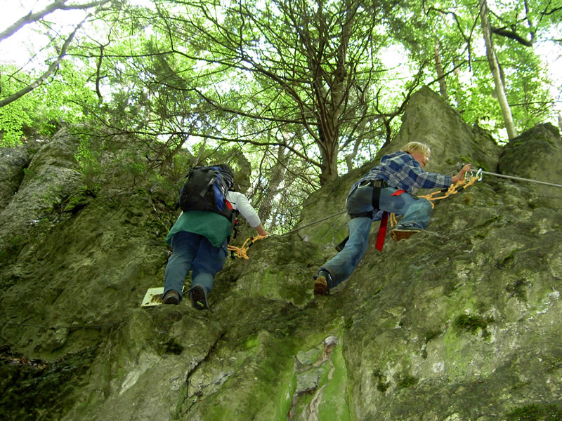 Entdeckt die Felsformationen am Norissteig! Bei der Amtsknechthöhle könnt ihr die ersten Erfahrungen am Klettersteig sammeln! Anschließend geht es über kleine Felsen zum Noristörl, auf das Noris-Brettl und weiter über kleinere Klettersteig- Stellen auf den Sprungstein. Am Ende erwartet euch noch ein toller Ausblick am Gipfel der Mittelbergwand! Auf eurer Klettersteigtour erlebt ihr tolle Aussichten und einen naturbelassenen Wald mit einzigartigen Felsformationen! Es besteht die Möglichkeit, einzelne Klettersteig-Stellen auf Wanderwegen zu umgehen und die Kletternden zu beobachten. Die Tour startet direkt vom Zeltplatz aus. So aufregend kann ein Familienurlaub in Deutschland sein! Das Team führt jeden, der möchte, ans Klettern heran!
