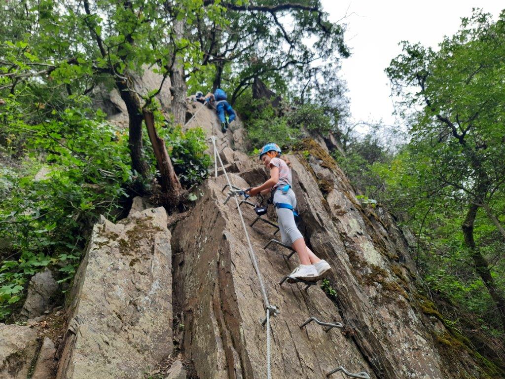 ein einzigartiger Klettersteig hoch über dem Rheintal mit fantastischem Ausblick! Ein gut gesicherter Steig führt euch hoch oben über zehn spannende Kletterstellen mit Stahlseilen, Eisenleitern, Trittbügeln und einem grandiosen, vertikalen Kletterfinale - und das alles in einer spektakulären Natur. Am Ende des Klettersteigs führt euch ein Pfad zum Aussichtspunkt, einem Gasthaus und zur Bergstation der nostalgischen Sesselbahn Boppard. Über einen alpinen Steig oder mit der Sesselbahn geht es wieder zurück. Dieser Programmpunkt ist geeignet für Kinder ab 7 Jahren mit Mindestgröße 125 cm und Familien mit sportlicher, körperlicher Konstitution.