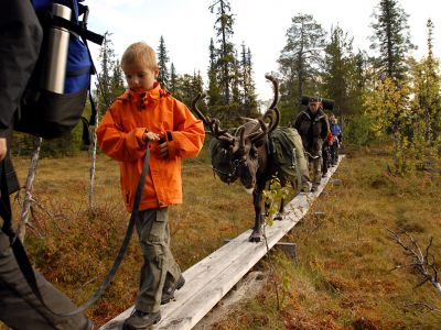 Familienweise sind Sie für eines der ausgebildeten Rentiere verantwortlich und führen es während der Wanderung zum nahegelegenen Hausberg Solberg. Vom Aussichtsturm genießen Sie einen herrlichen Blick über die endlosen Wälder Lapplands. An der Hütte stärken wir uns bei getrocknetem und geräuchertem Rentierfleisch.