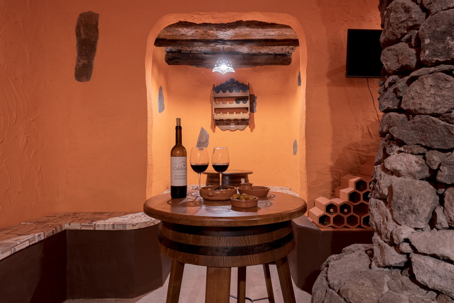 - Höhle: ca. 75 qm (für 1-4 Personen), 2 Schlafzimmer (eines mit Doppelbett und Tür, eines mit 2 zusammenstellbaren Einzelbetten und Vorhang als Zimmertürersatz), gemütliche Sitznische mit Sofa und TV, Küche mit Essplatz, 1 Bad mit DU/WC, große möblierte Panoramaterrasse (ca. 70 qm) mit Meerblick, etwas abseits am Rand der Anlage sehr privat gelegen, eine der Höhlen ohne Klimaanlage (spezielle Belüftungstechnik)
