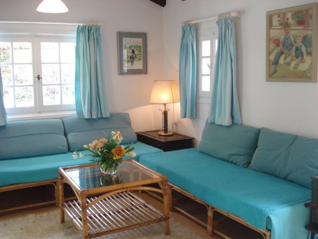 Ferienwohnung Lithos – 4 bis 5 Personen, ca. 44 qm - Die untere Etage eines zweistöckigen Hauses. Schlafzimmer mit Doppelbett und Badezimmer, Küche/Esszimmer, Wohnzimmer mit 2 Betten und Platz für ein drittes, 2 Terrassen, großer Garten, Heizung, Ventilator.