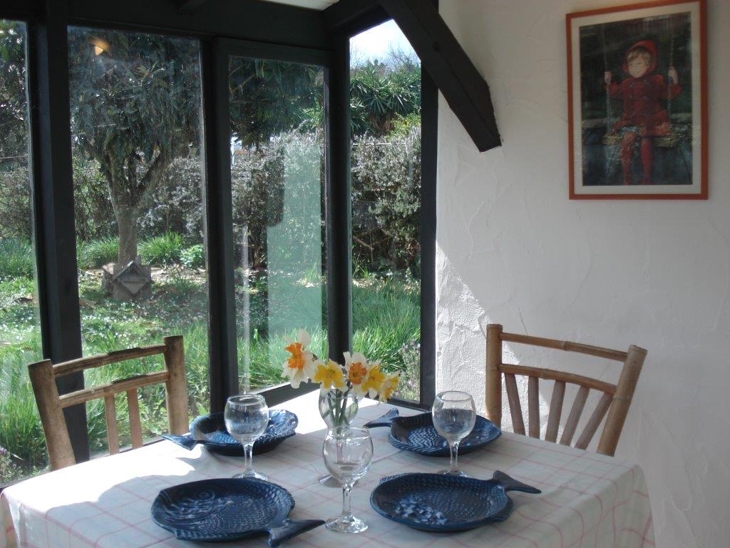 Ferienhaus Prasino - 4 bis 5 Personen, ca. 50 qm - Schlafzimmer mit Doppelbett, Wohn-Schlafzimmer mit Schlafsofa für 2 Personen und Zustellbett bei Bedarf, sonnige, verglaste Essecke, Küche, Badezimmer, eigener Gartenbereich mit abschließbarem Zugang zum Swimmingpool, Parkplatz vor dem Haus, Heizung, Ventilator