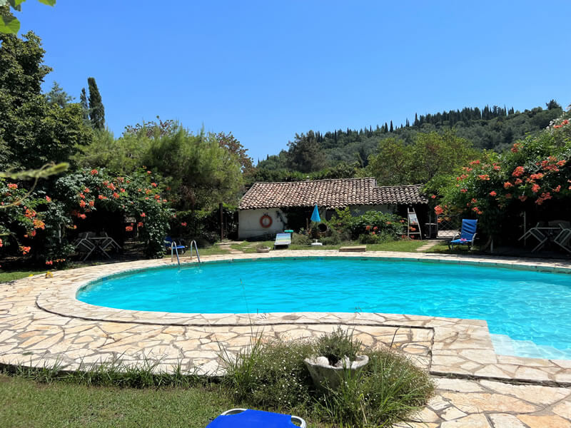 Ferienhausurlaub auf Korfu in einer ehemaligen liebevoll restaurierten Ölmühle mit großem mediterranen Garten mit Pool, Baumhaus und Yogaraum. Die 8 Ferienhäuser und Studios mit eigener Terrasse oder Balkon bieten viel Komfort und Gemütlichkeit für Gäste mit und ohne Kinder.