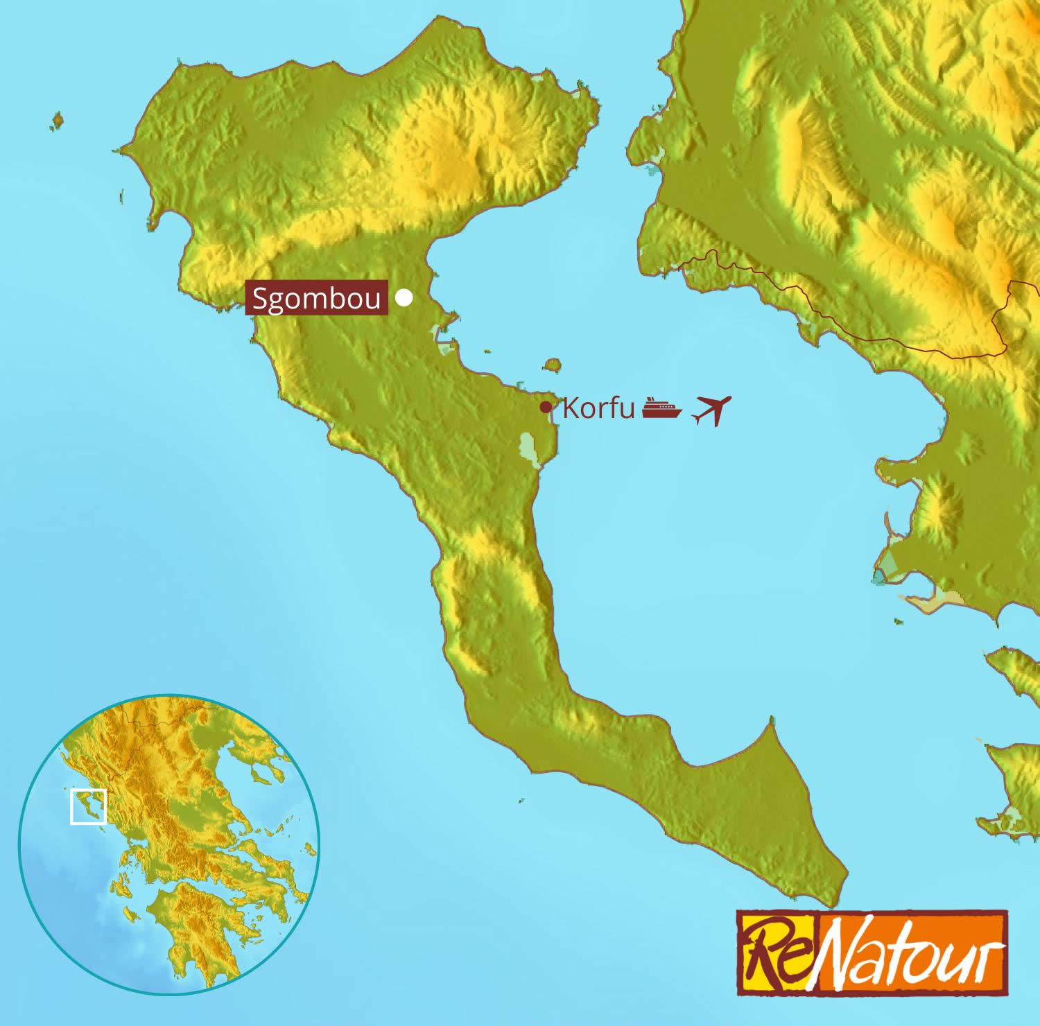Anreise- Mit Bahn/Auto und Fähre: Bahnfahrt nach Ancona (Fahrzeit z.B. von München ca. 11 Std.). Alternativ Autofahrt nach Ancona (Entfernung von München ca. 800 km, Fahrzeit ca. 8 Std.). Fährfahrt ab Ancona mit Umstieg in Igoumenitsa nach Korfu (Dauer ca. 28 Std.)