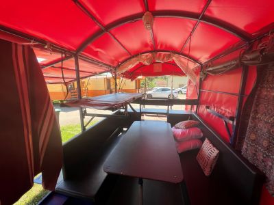 - Das rote Wagenmodell bietet mit einer großzügigen Essecke, die zum Doppelbett umgebaut wird, und zwei Klappliegen ebenfalls Platz für bis zu 4 Personen. Dank der Leichtbauweise mit einer Plane ist dieser Wagen - ausgestattet mit Licht, Regalen sowie Heizung und einem kleinen Kühlschrank (Stromversorgung auf den Stationen) - besonders einfach zu steuern. Die Küche ist außen am Wagen angebracht, und bei Regen kocht man im geräumigen Vorzelt. Bei diesem Modell sind eigene Schlafsäcke mitzubringen. - Anreise nur am Sonntag möglich.