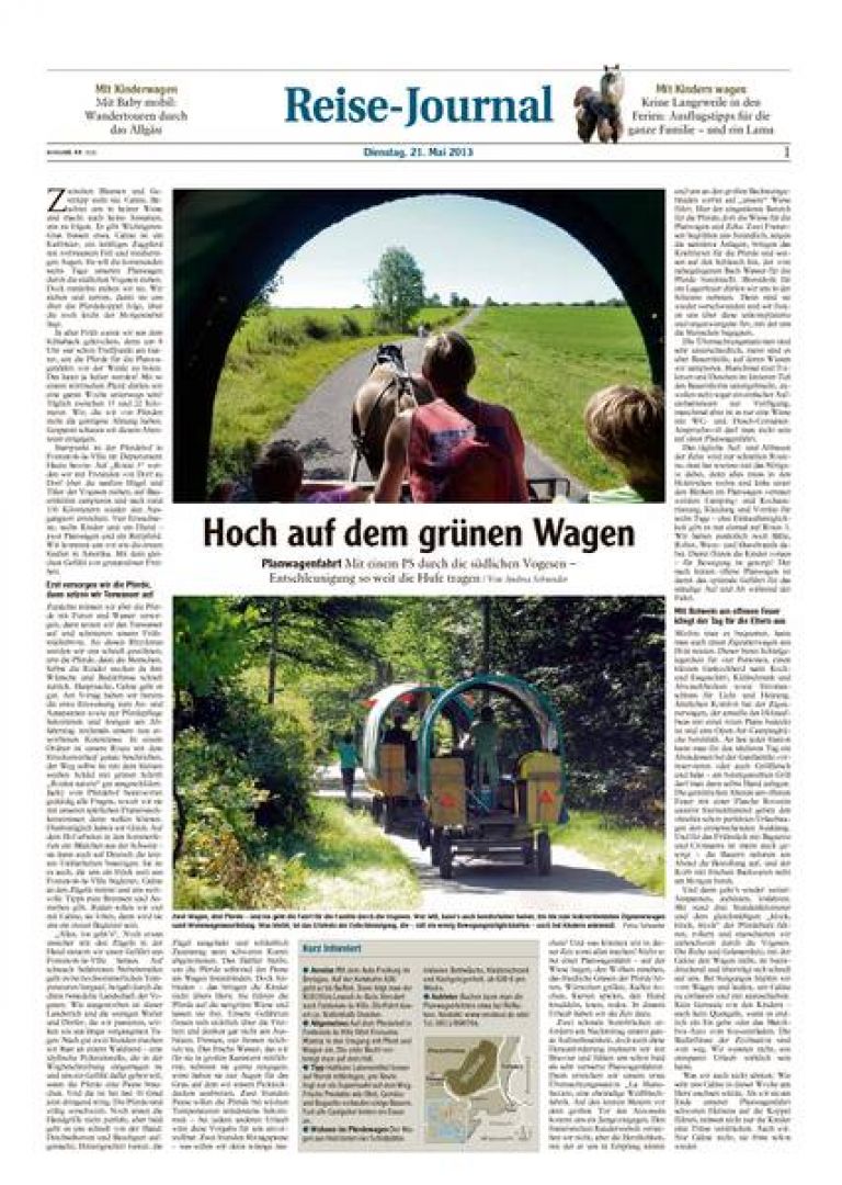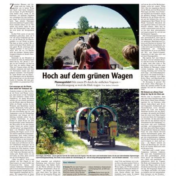 Christoph, Bauer, HIMBEER09.05.2011...... Ein Leben wie im Kinderbuch. Mit der Zigeunerkutsche geht es im Schritttempo durch die traumhafte Landschaft der Haute-Saône am Rande der Vogesen. Für die Erwachsenen ist es die Entdeckung der Entschleunigung, für Ella und Martha eine aufregende Abenteuerreise, die sie gemeinsam mit ?ihrem? Pferd Lolita durchleben.......Lesen Sie den kompletten Artikel im pdf!Hoch auf dem Pferdewa-a-gen...