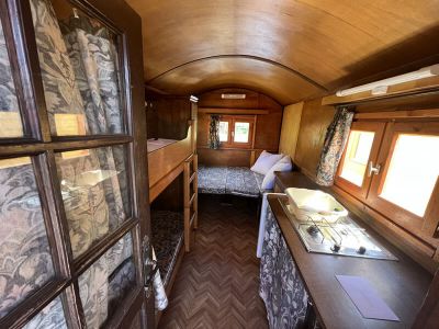 - Der klassische Wagen aus Holz ist mit 4 Schlafplätzen, einem Kleiderschrank, Licht, einer Kochgelegenheit, Koch- und Essgeschirr und einer Essecke, die für die Nacht zum Doppelbett umgebaut wird, ausgestattet. Der kleine Kühlschrank und die Heizung werden auf den jeweiligen Stationen mit Strom versorgt. Die festen Holzgehäuse machen die Wagen auch im Frühjahr und Herbst zu einem gemütlichen rollenden Feriendomizil. Bettlaken, Kopfkissen und Kissenbezüge sind vorhanden. Bitte bringen Sie eigene Schlafsäcke mit. - Anreise: Donnerstag, Freitag und Samstag möglich.