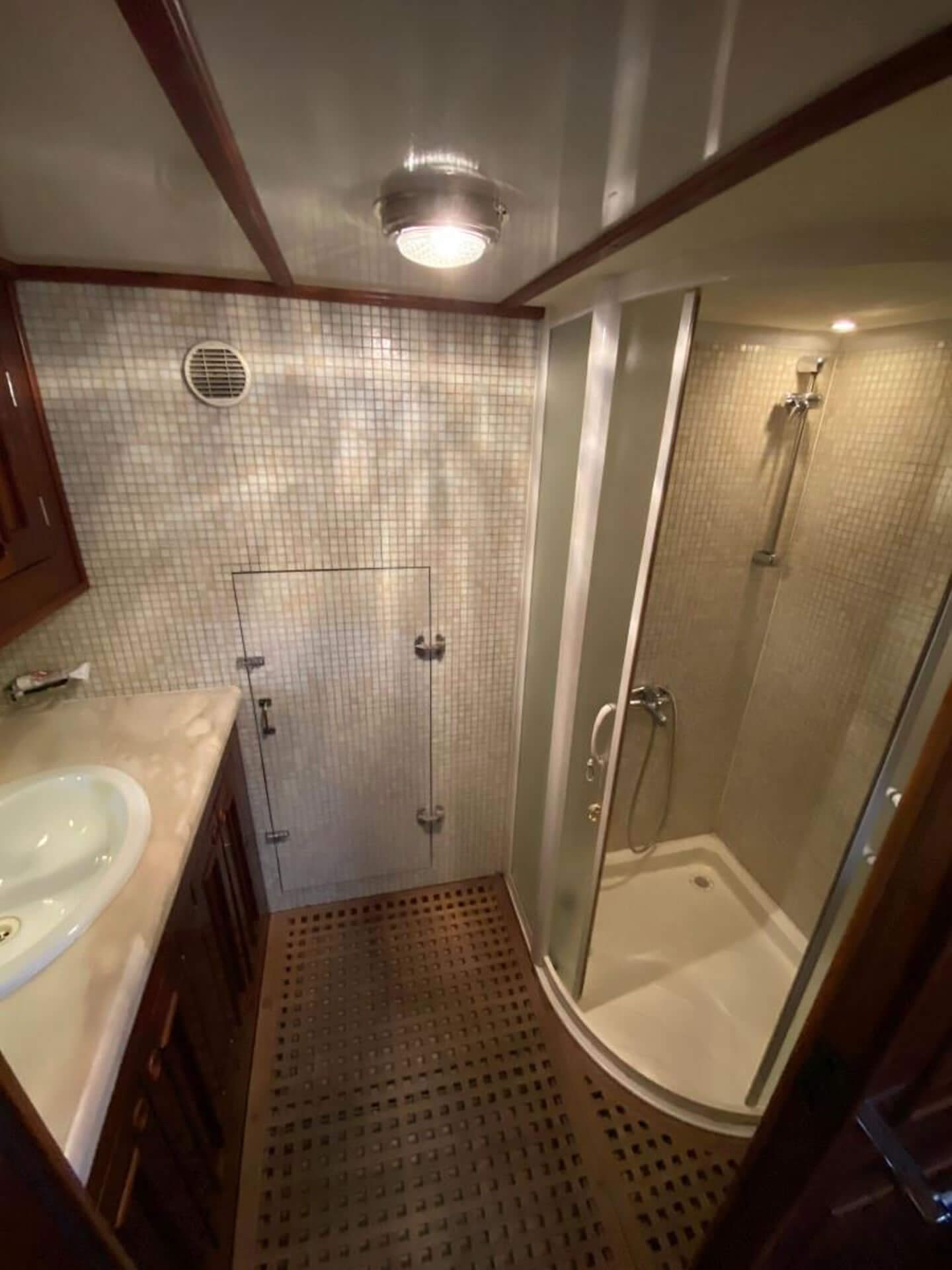 Zwei WCs gibt es an Bord. Ein kleines und ein größeres mit Waschbecken. An Deck befindet sich eine Außendusche. Die Dusche bei der Eignerkabine wird in der Regel nur genutzt, wenn ein Duschen an Deck nicht möglich ist. Sollte in einer Marina (Yachthafen) übernachtet werden, bietet es sich an, dort die sanitären Anlagen zu nutzen.