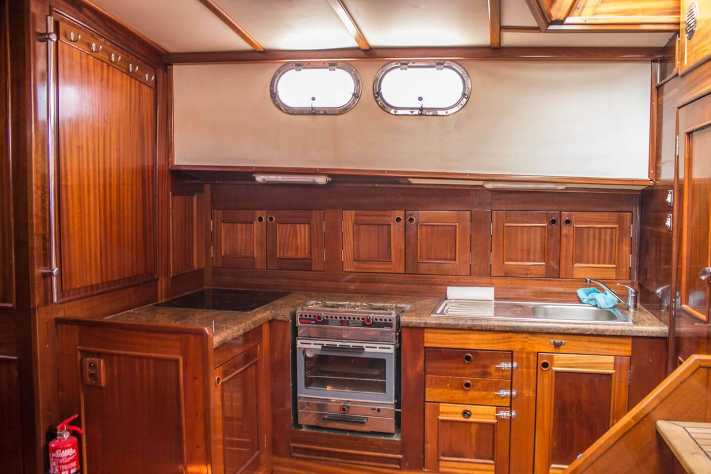 Die große Küche mit massiver Arbeitsplatte aus Marmor bietet einen Herd, Backofen und Spüle. Nebenan ist ein geräumiger Vorratsraum mit Kühlschrank und Eisfach. Herd und Backofen funktionieren mit Ethanol. Im Hafen bzw. wenn Landstrom verfügbar ist, kann das Induktionskochfeld genutzt werden. Bei Windstille und wenn es behördlich erlaubt ist, kann an Land gegrillt werden.