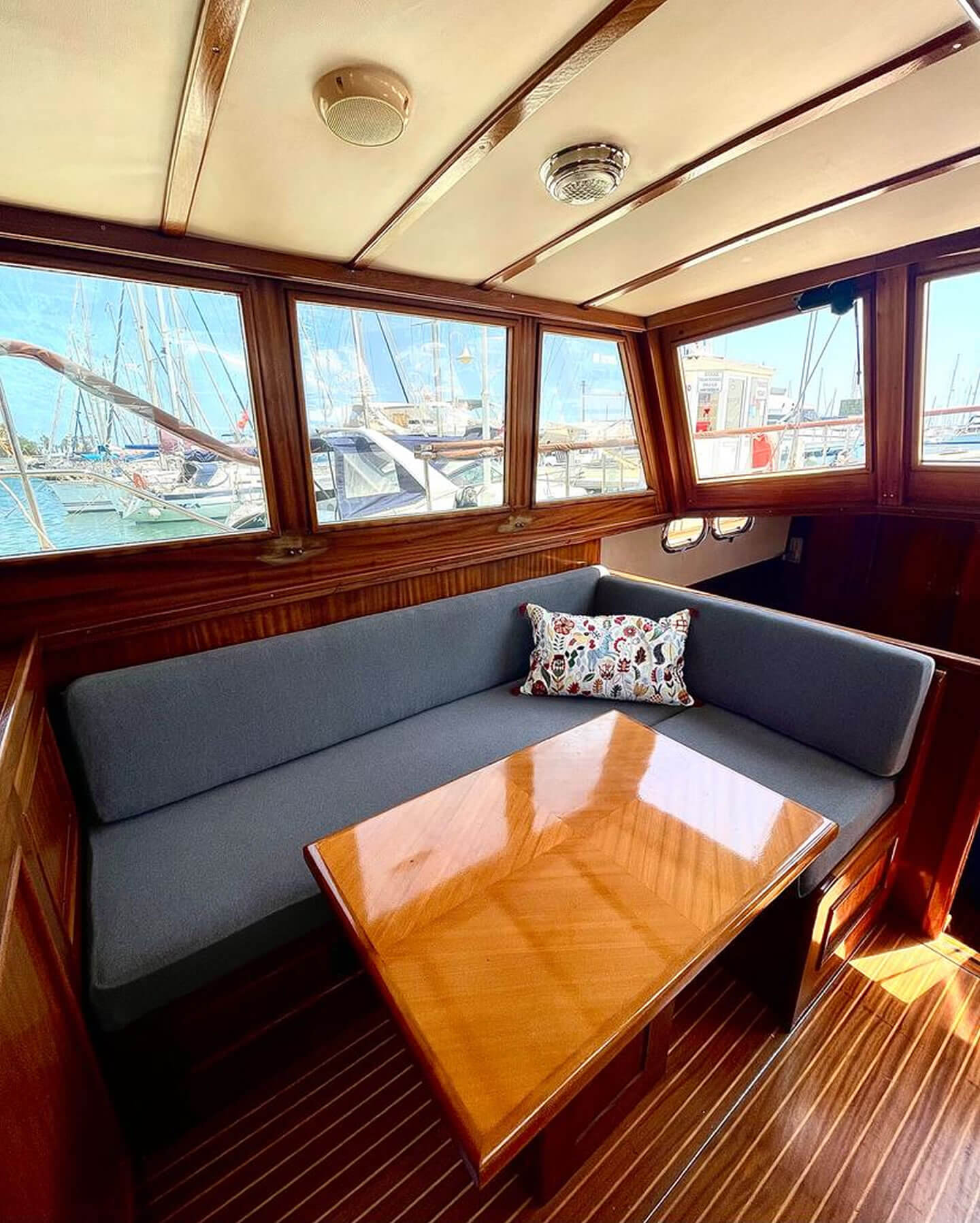 Wer Charterboote kennt, wird staunen. Auf der Nautika hat man Stehhöhe in allen Bereichen. Wie oben auf dem Deck so ist auch unter Deck viel Platz, viel mehr als es auf Charteryachten ähnlicher Größe in der Regel gibt. Ein Sitzbereich befindet sich gleich nach dem Eingang neben dem Steuerstand. Hier kann man es sich bequem machen und ein Buch lesen, manche Gäste nutzen den Tisch auch mal, um mit dem Laptop zu arbeiten.
