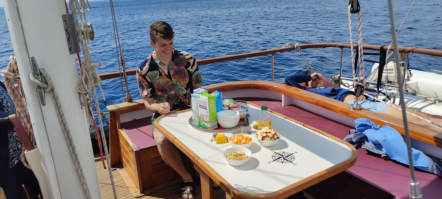Ob ihr lieber essen geht oder an Bord selbst kocht, könnt ihr frei entscheiden. Entsprechend erfolgt euer Einkauf der Lebensmittel am Anreisetag. Unser Skipper kennt die Region und kann gute Tavernen vorschlagen und einen Tisch reservieren. Kochen, Tisch decken, Abspülen und was noch dazu gehört, erledigt ihr selbt.