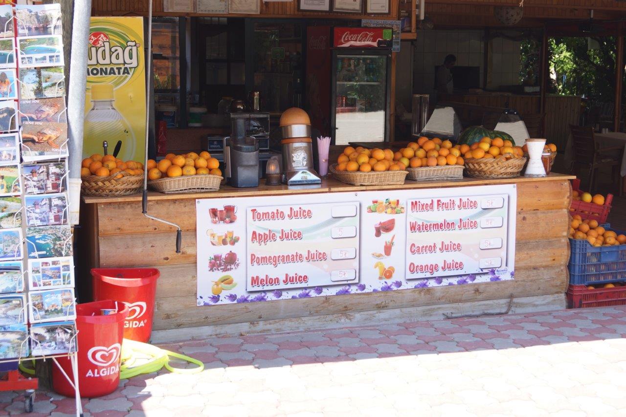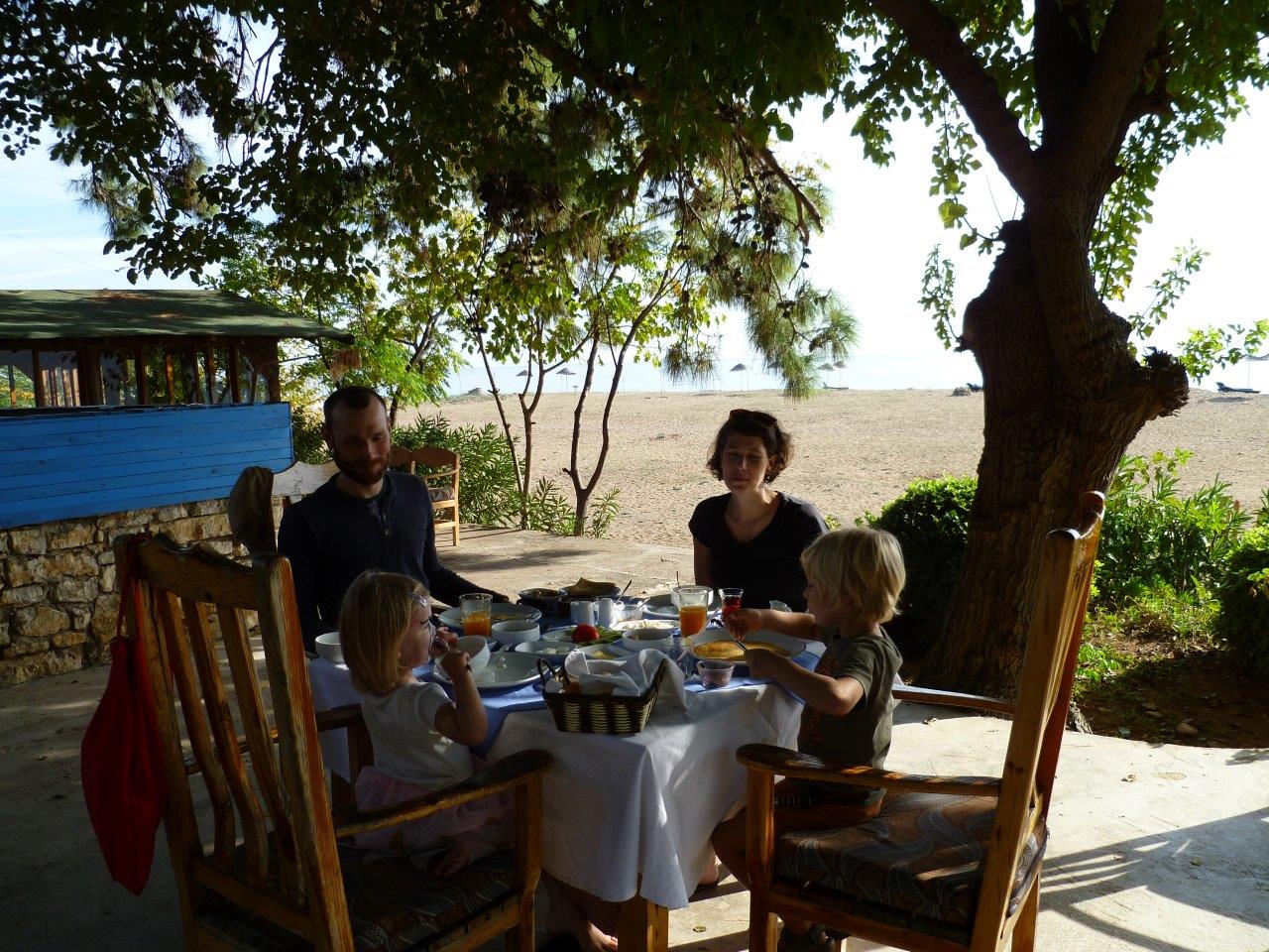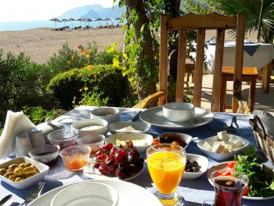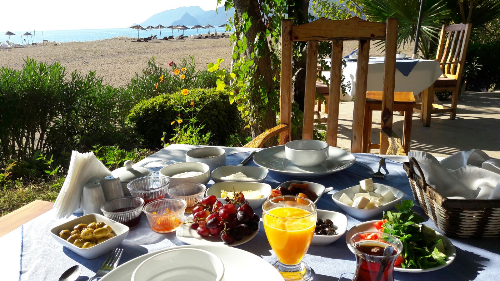 - Direkt am Sandstrand: Vielseitiges türkisches Frühstück, u. a. mit frischen Tomaten, Gurken und Oliven, Müsli, frisch gepresstem Orangensaft, Joghurt, Pfannkuchen, Eiern, selbst gebackenem Brot, verschiedenen Marmeladen, Käse, Honig und natürlich Kaffee und Tee