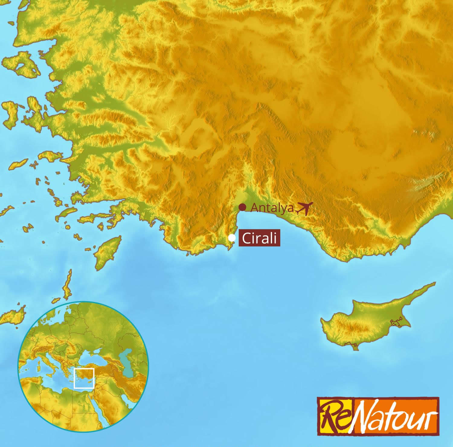 Anreise- Mit dem Flugzeug: Flug bis/ab Antalya. Weiterfahrt mit dem Mietwagen bis Cirali (ca. 96 km. ca. 1,5 Stunden) oder Taxi bzw. Taxitransfer buchbar. Klimabewusst reisen: Fliegen Sie atmosfair!