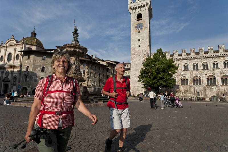 Per Bus entlang des berühmten Castello di Toblino ins „Tal der Seen“. Wanderung zum Lago Terlago, wo der Höhenweg des Heiligen Vigil beginnt. Einsame Wälder und karstige Hochflächen bringen sie hinauf zu alten Festungen und Bollwerken. Fantastische Tiefblicke auf das unter Ihnen liegende Etschtal und die Dolomiten und Abstieg nach Trient, wo ein Besuch der Altstadt mit zahlreichen Kirchen und Palazzi lockt.